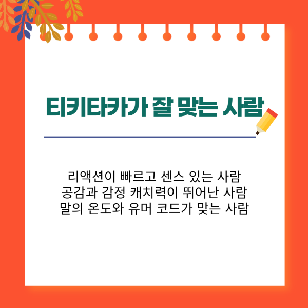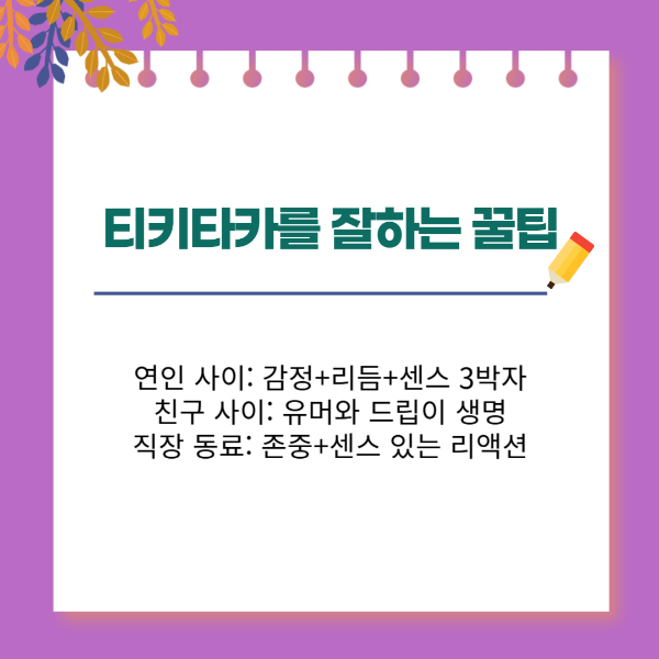 티키타카는 말만 잘하는 게 아니라, 감정을 읽는 능력도 중요해요. 말을 길게 하지 않아도 “음~” “그치~” “아 그거 알지!” 같은 말로 상대의 감정선에 맞춰주는 사람이 티키타카 최강자예요.